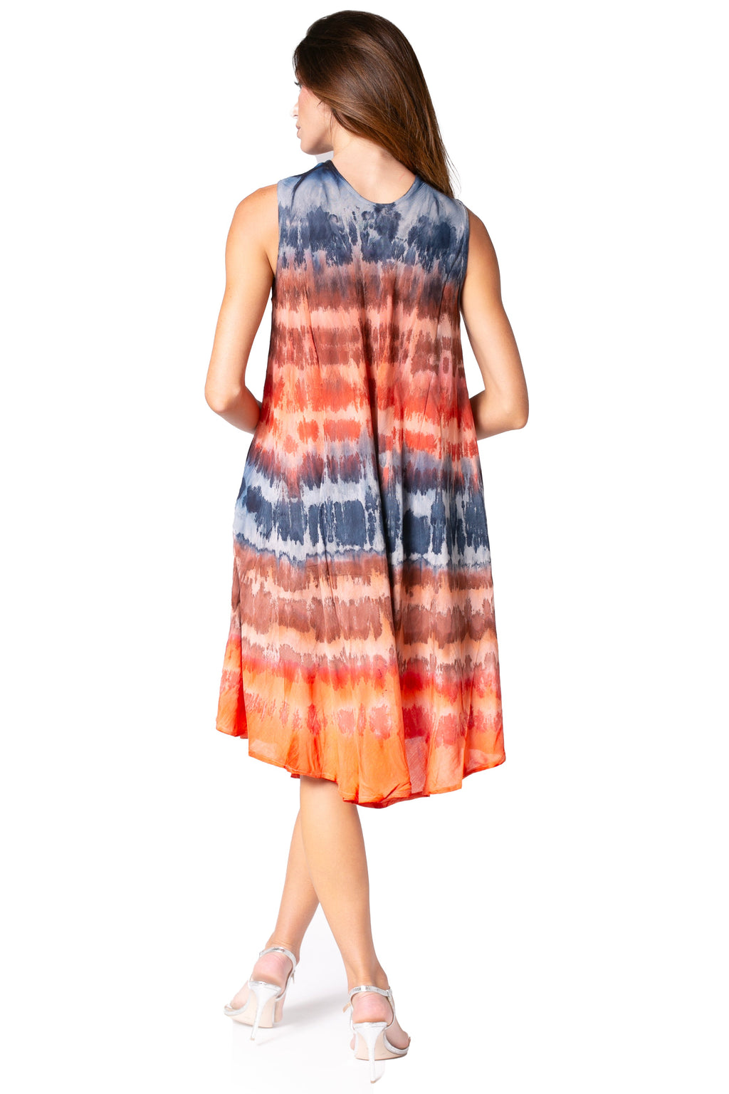 Sleeveless dress features tie dye print, relaxed fit and rayon fabric in beautiful colors.