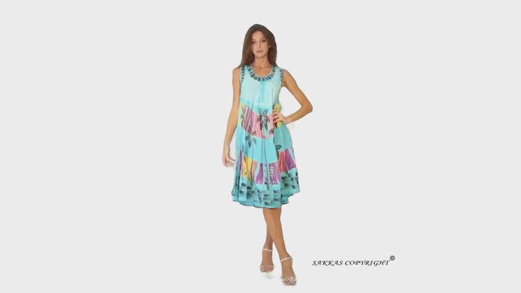 Sleeveless caftan dress features unique multi color design, embroidered details and relaxed fit.