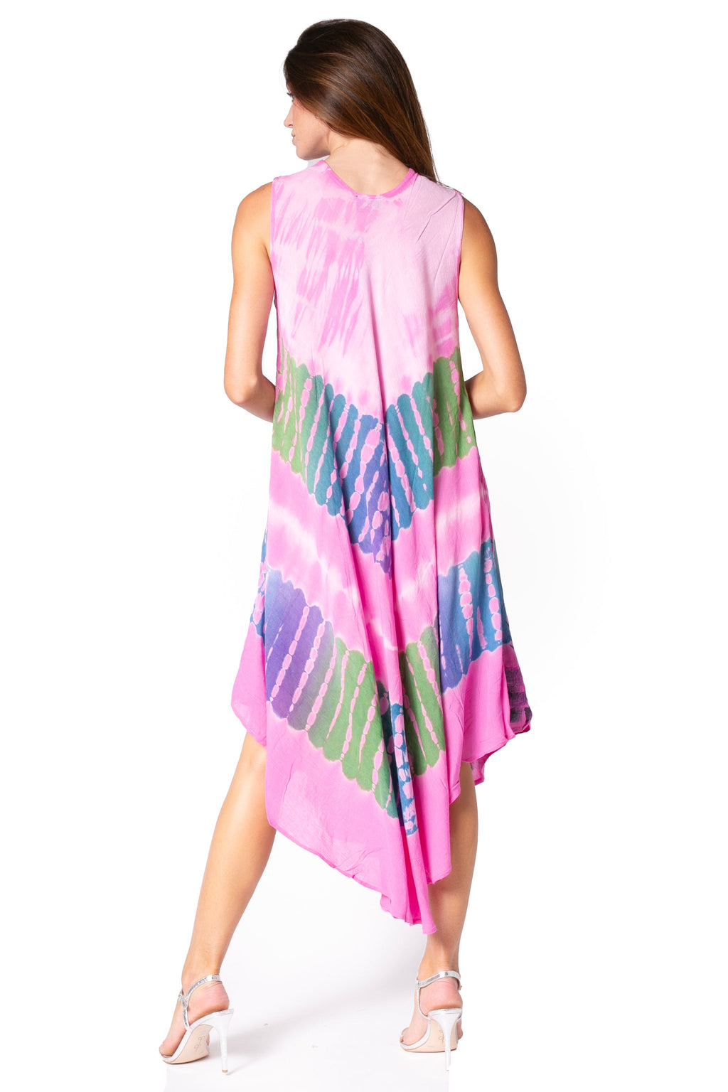 Sleeveless caftan dress features unique tie dye design, embroidered details and relaxed fit.