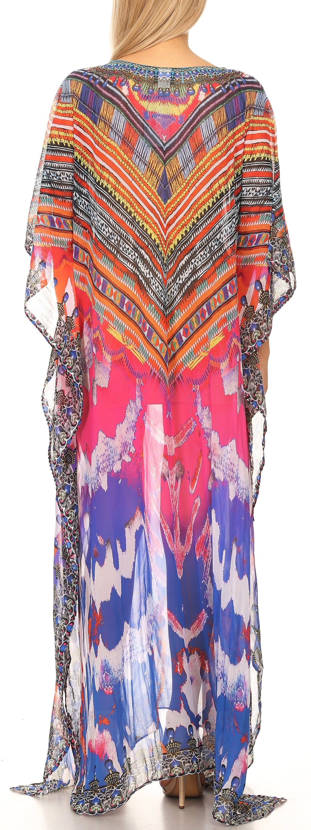 This kaftan dress coverup features a loose fitting cut fit with no structure so that the caftan falls and drapes beautifully without being restrictive. All the colors and patterns are unique. The rhinestone detail at the neck adds some sparkle. The fabric is thin but durable. Can be worn as beachwear, or layered over during cooler weather. Can be styled with shorts or pants, the options are endless with this summer dress!
