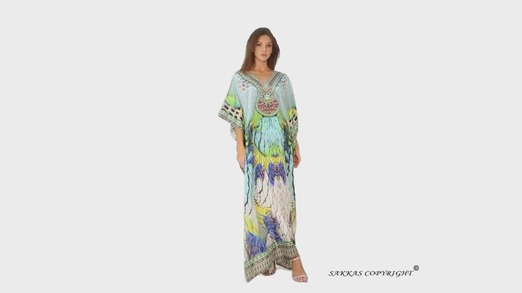 This caftan dress cover up is made of a lightweight material with no structure so that it drapes effortlessly and elegantly. It is very forgiving and loose fitting for maximum comfort and best wear. Colors are very vibrant and unique. Each dress is handmade and timeless.