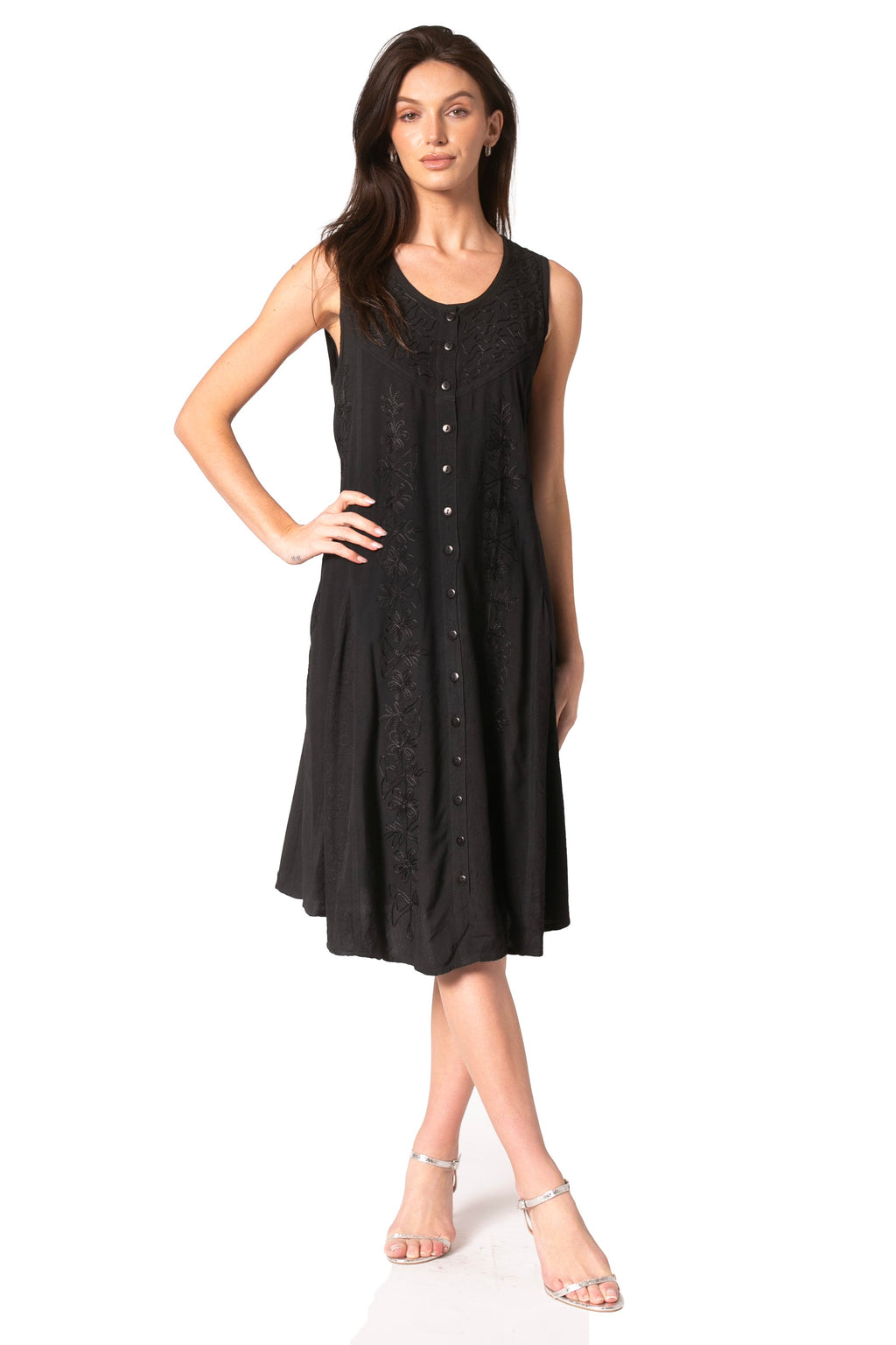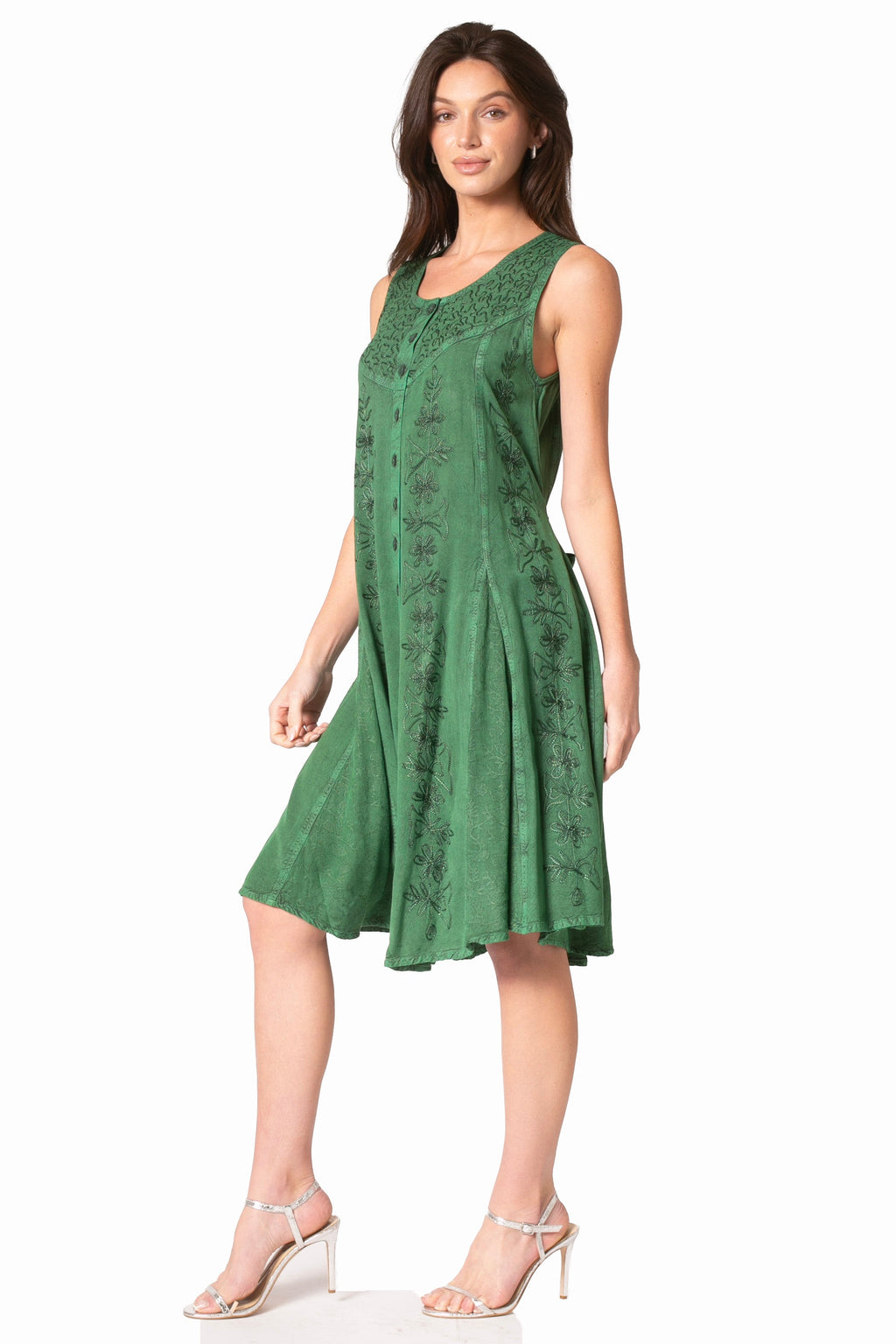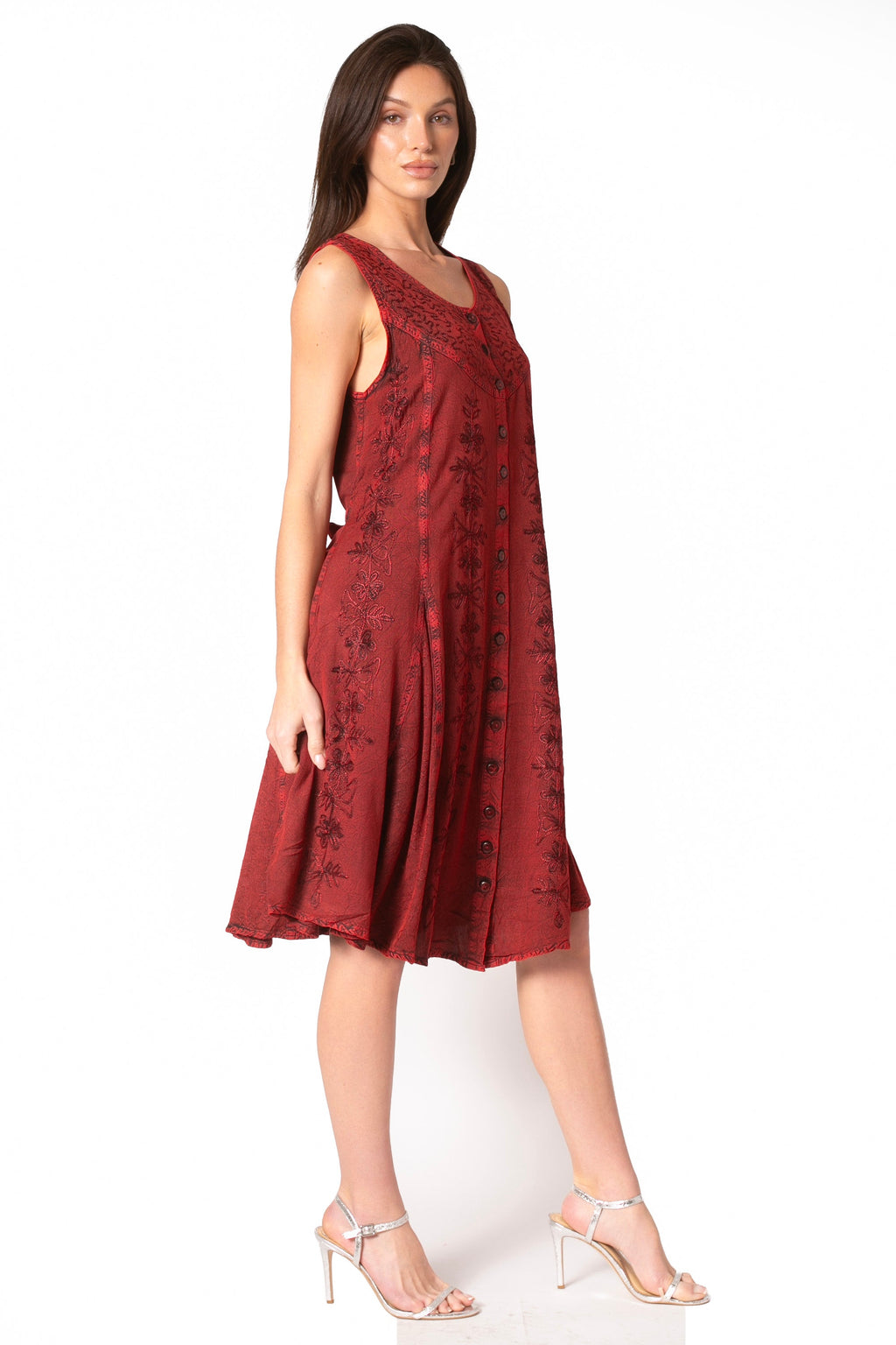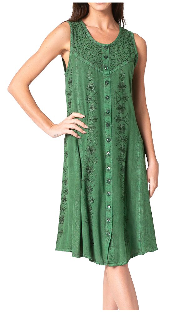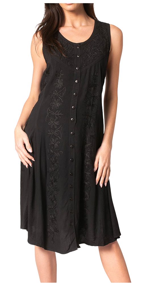 Features beautiful embroidery designs at front of dress, button down front and can open from front, adjustable ribbon tie in back, scoop neck, sheer darts at bottom of dress. Lightweight rayon fabric makes this dress perfect for any occasion and great for warmer weather! Dress also makes for a great cover up at the beach or on a boardwalk. Dress can be paired with flats, sandals, or worn with leggings for colder environments. Hand wash separately in cold water. Line dry. Imported.