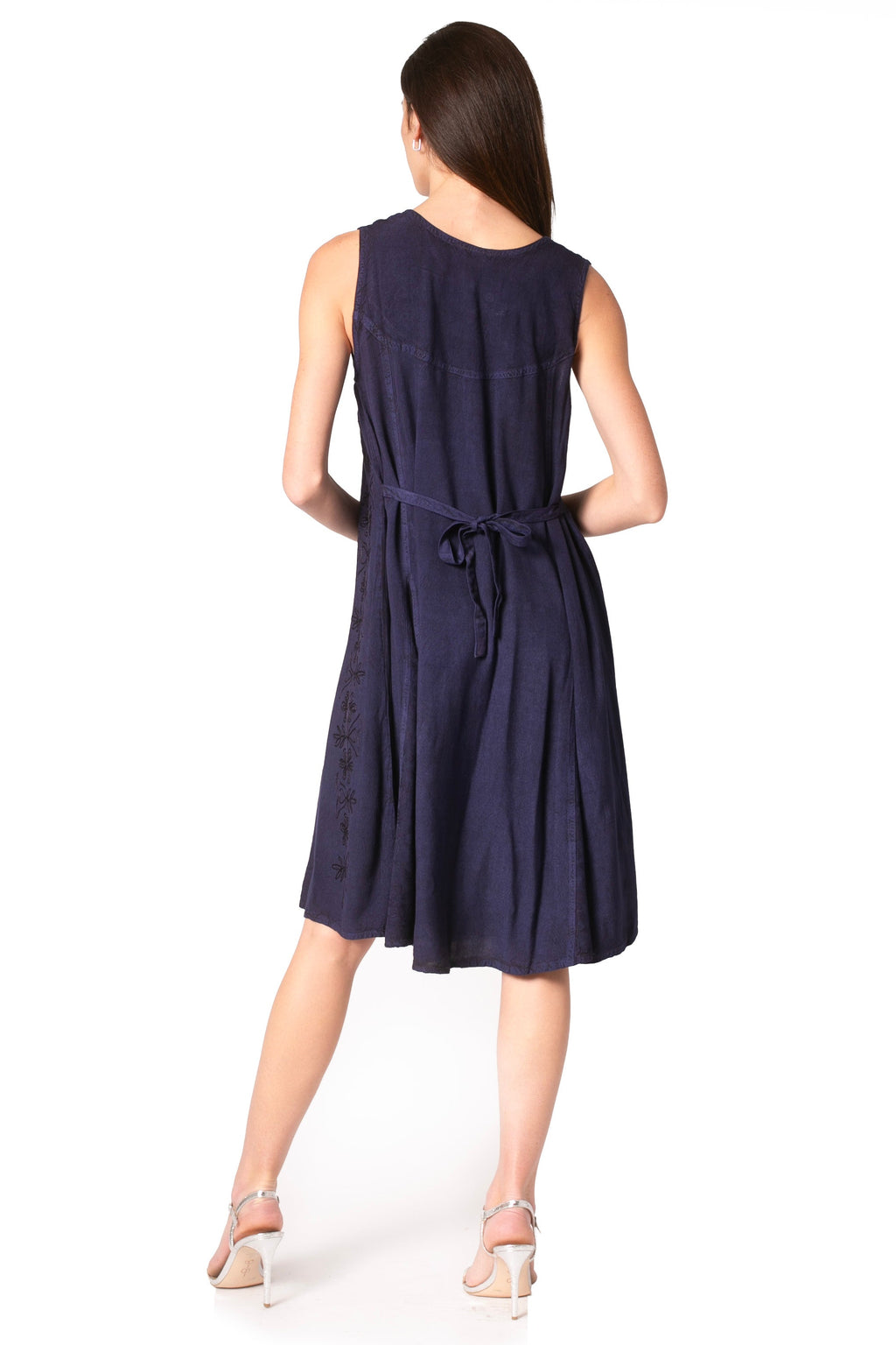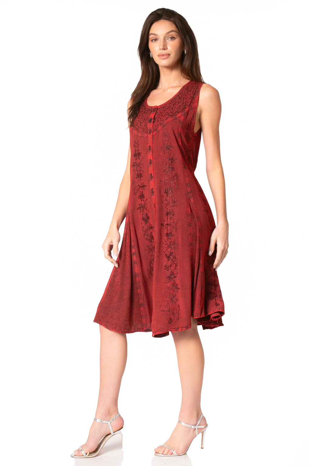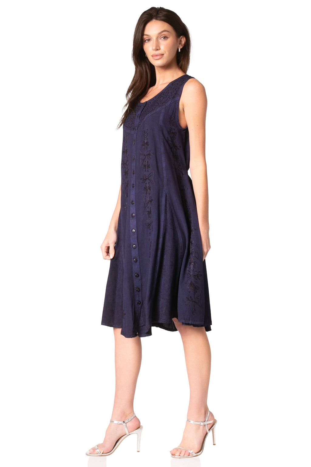 Features beautiful embroidery designs at front of dress, button down front and can open from front, adjustable ribbon tie in back, scoop neck, sheer darts at bottom of dress. Lightweight rayon fabric makes this dress perfect for any occasion and great for warmer weather! Dress also makes for a great cover up at the beach or on a boardwalk. Dress can be paired with flats, sandals, or worn with leggings for colder environments. Hand wash separately in cold water. Line dry. Imported.
