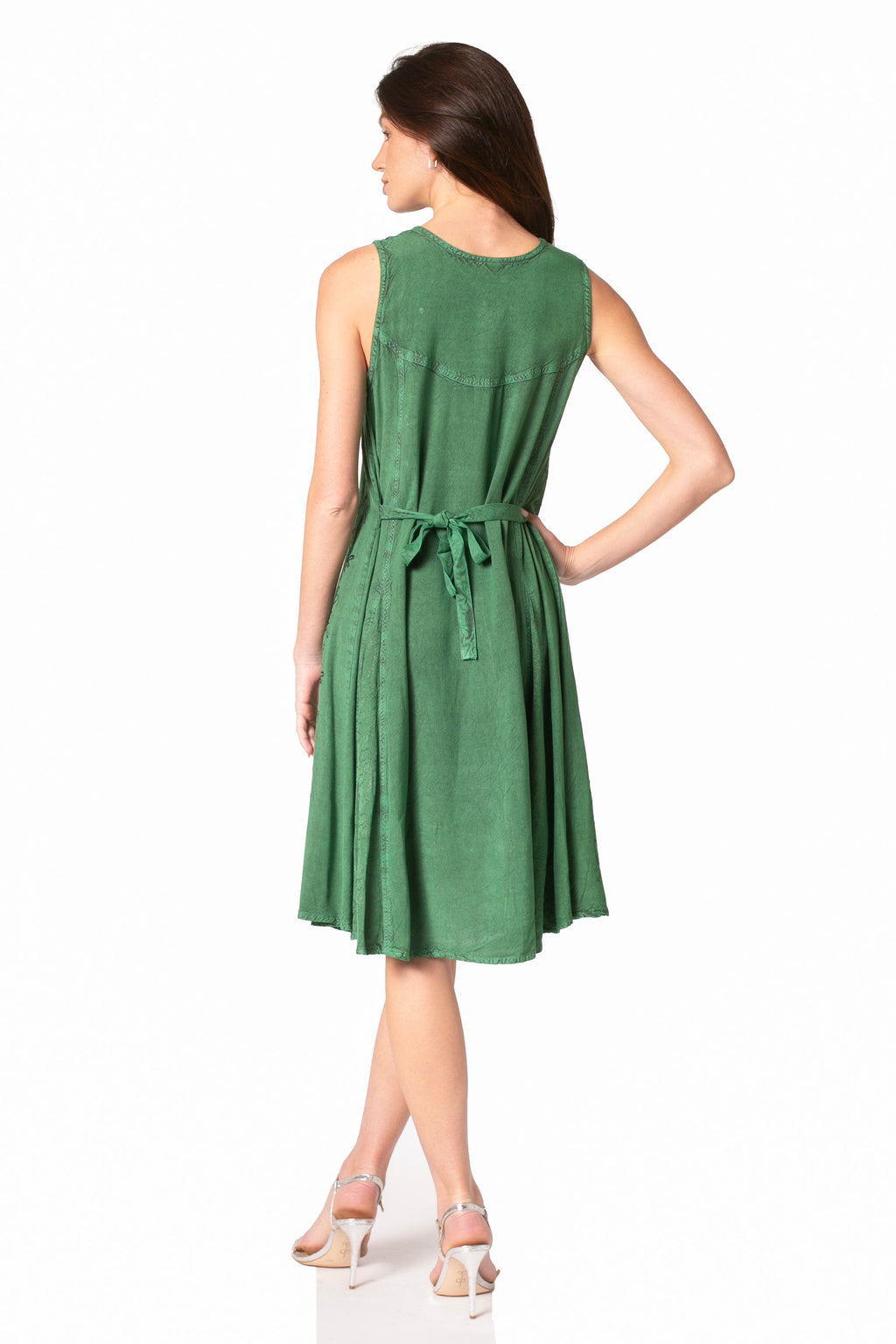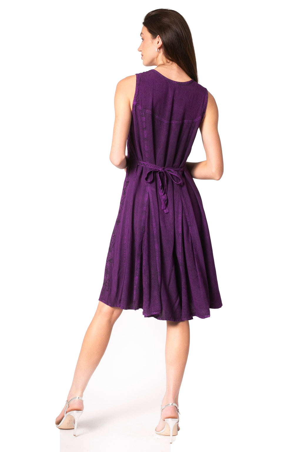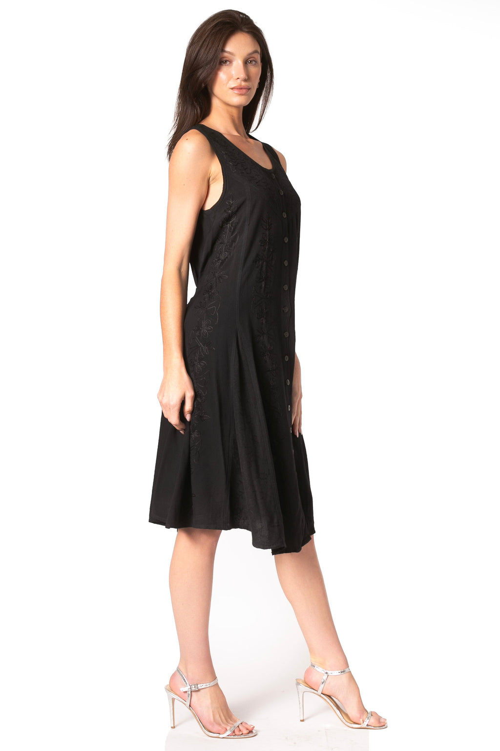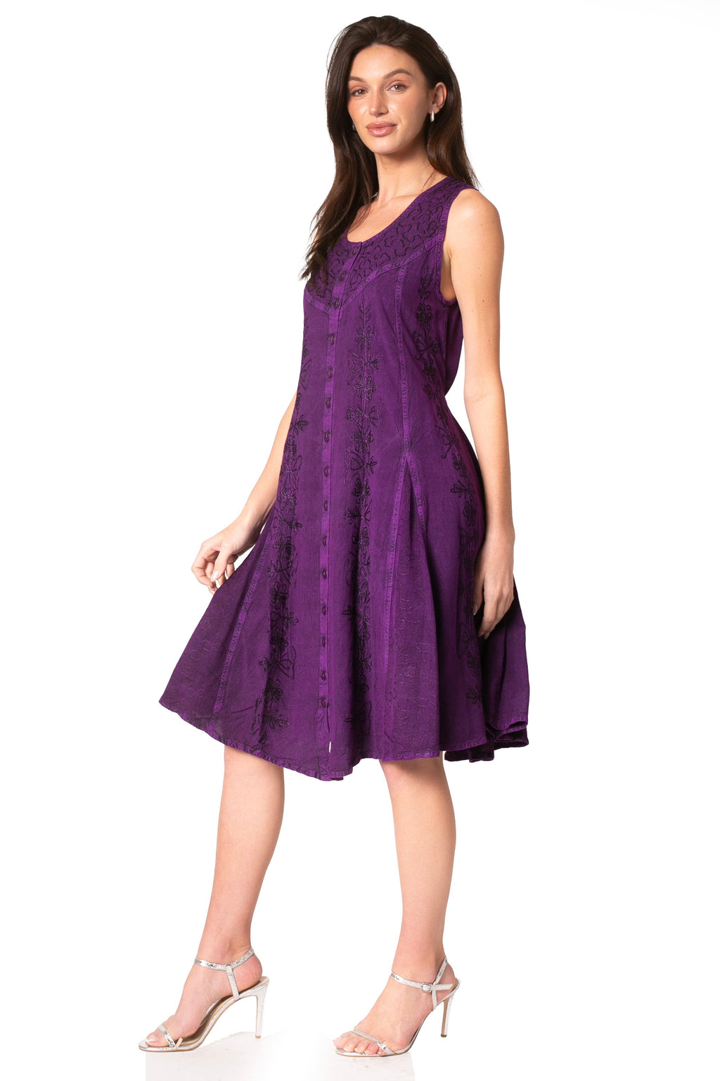 Features beautiful embroidery designs at front of dress, button down front and can open from front, adjustable ribbon tie in back, scoop neck, sheer darts at bottom of dress. Lightweight rayon fabric makes this dress perfect for any occasion and great for warmer weather! Dress also makes for a great cover up at the beach or on a boardwalk. Dress can be paired with flats, sandals, or worn with leggings for colder environments. Hand wash separately in cold water. Line dry. Imported.