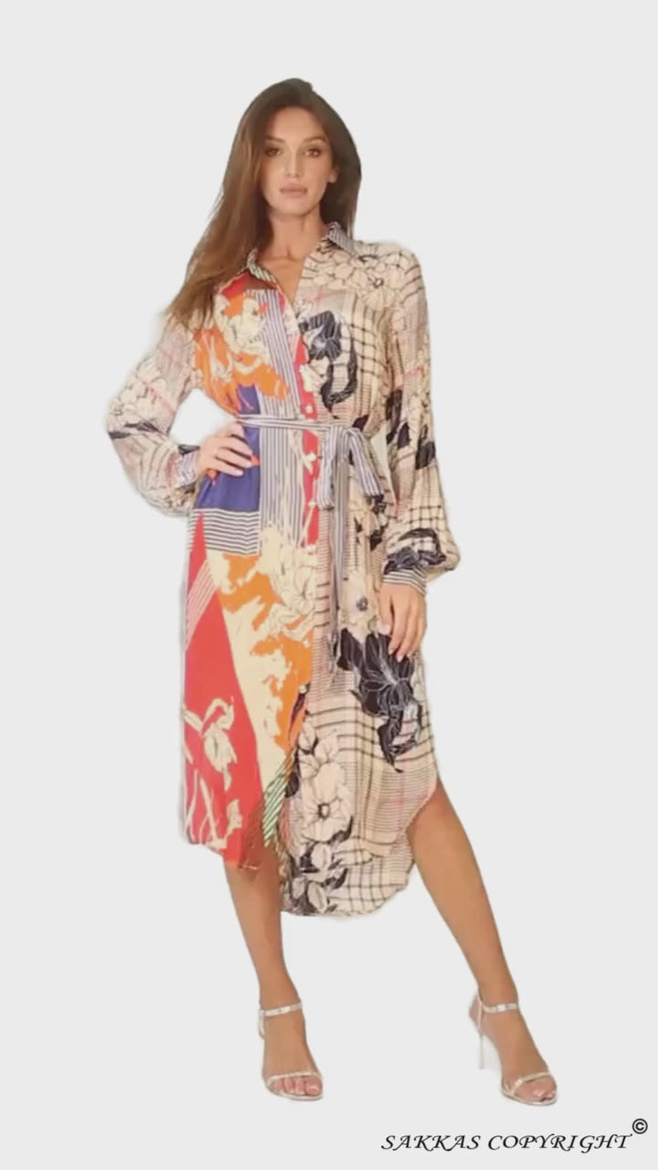 The Rina dress is a beautiful shirt dress maxi with a button-down front, shirt collar, 3/4 sleeves, side pockets, and matching sash/belt. The dress is made with lightweight material, finished with a vibrant print and a high low shape, flounce, and flared bottom.