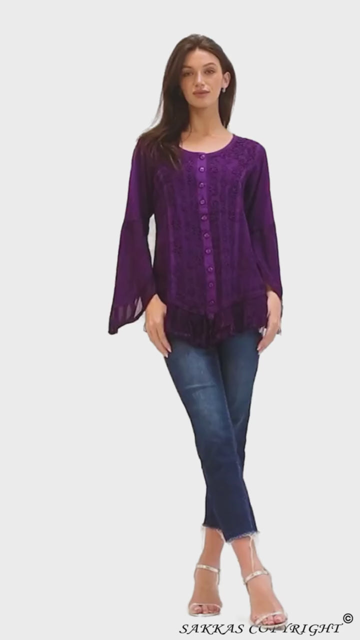 Feminine Fit: The basic top you were waiting for, easy to wear and care. Fits regular sizes 0-14 approx. Made with 100% Rayon material and gorgeous trims. This is definitively a one of a kind top. Waist length with fan sleeves. Follow care instructions to have this lovely garment last you and preserve colors.
