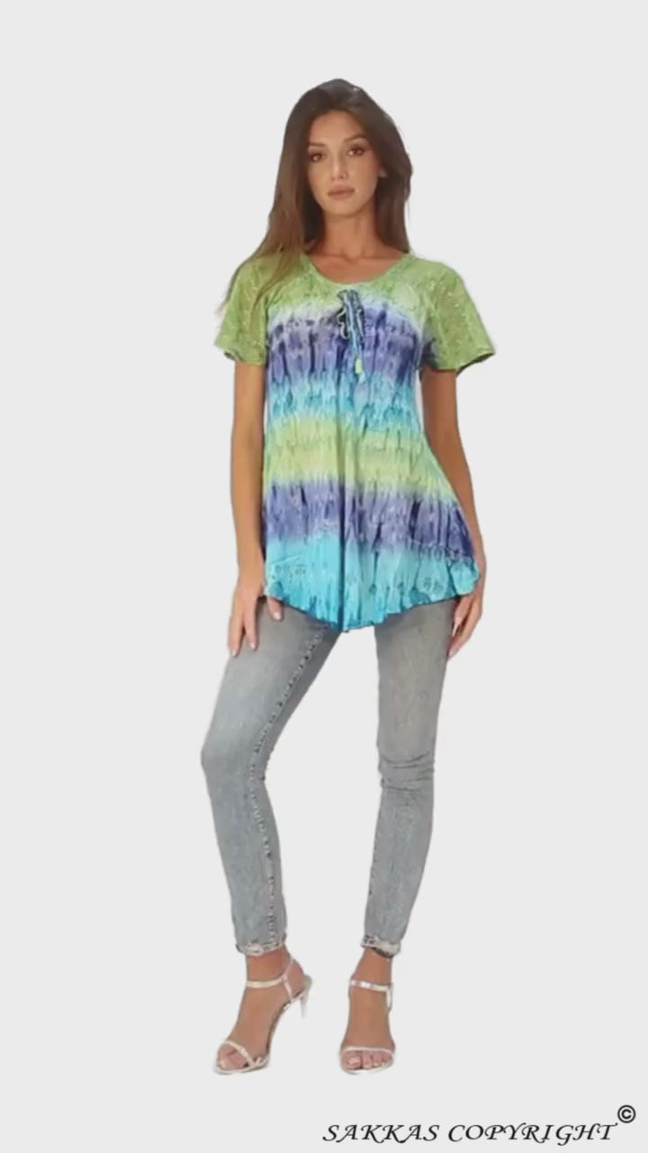 This blouse features a long and tall cut. The neckline features a corset enclosure with adjustable drawstrings that can be used to better adjust the neck opening. The sleeves are lace embroidery cap sleeves and are semi sheer. The design of the blouse is an ombre tie dye striped wash. The fabric of this blouse is very lightweight and opaque except for the sleeves of the blouse. To style this blouse, wear with your favorite fair of pants, shorts, denim, trousers, skirt, or you can even layer over a dress. Perfect for spring and summer weather! You can also wear it as a cute coverup to the beach! For cooler weather, wear with a cardigan or coat and boots. Hand wash separately in cold water. Line dry. Imported. | Material: 100% Rayon.