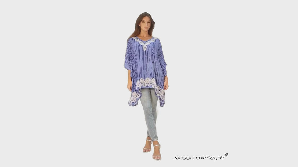 FEMININE RELAX FIT : This kaftan caftan top is handmade and hand dyed, made of soft and lightweight rayon fabric. The embroidery detailing runs along neckline, and bottom hem. Blouse / Poncho cut is a classic cut, with V-neck a wide and comfortable arm opening that is not restricted. Crinkle with tie dye and batik finish. Tunic length with lots of fullness and flare at bottom. It can fit any body type from slim to plus sizes and will look great on every body types. Colorful and comfy blouse