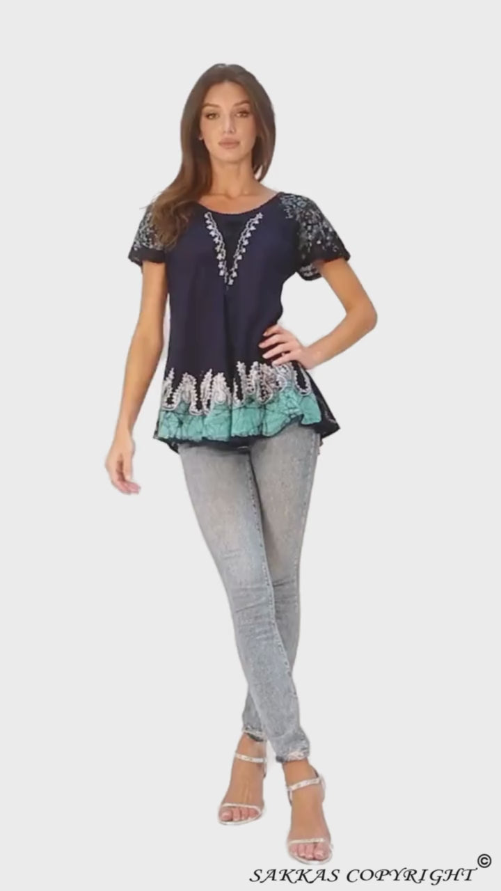 Women's Cora blouse features delicate embroidery, cap sleeves, unique fabric design and relaxed fit. Beautiful blouse perfect for summer festivals, beach days, casual wear or sight seeing. Hand wash separately in cold water. Line dry. Imported. | Material: 100% Rayon