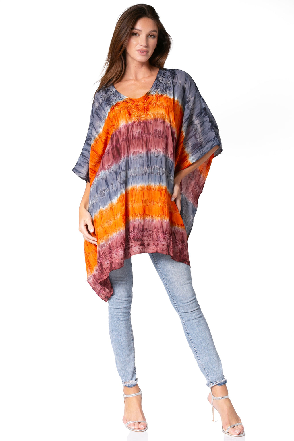 This poncho is handmade and hand dyed, made of soft and lightweight fabric. Tie dye print in beautiful colors with relaxed fit The embroidery detailing runs along neckline, and bottom hem. Neck drop meets in a v shape, and is a mid length neck drop. Poncho cut is a classic cut, with a wide and comfortable arm opening that is not restricted.