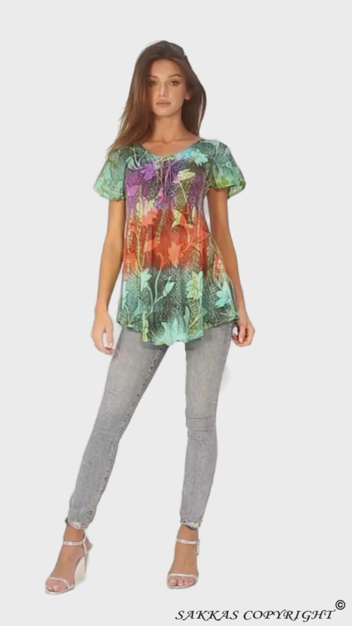 Women's sequin blouse features delicate embroidery, sequin accents, multicolor tie dye floral print and a comfortable relaxed fit. Lightweight semi-sheer fabric makes this blouse great for warm weather! Perfect for summer festivals, beach days, casual wear or sight seeing. Hand wash separately in cold water. Line dry. Imported. | Material: 100% Rayon